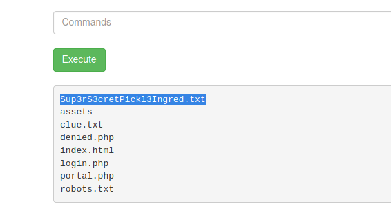 We're greeted with an executable script and I can see from running ls that there's a filed called Sup3rS3cretPickl3Ingred.txt, but trying to use cat through here was blocked, so we have to grab a shell if we want this file.